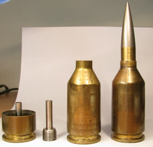 14.9mmSOPは、M61バルカン砲に使用される弾薬(20x102mm)のケース(薬莢)を14.9mmにネックダウンしたライフル弾です。