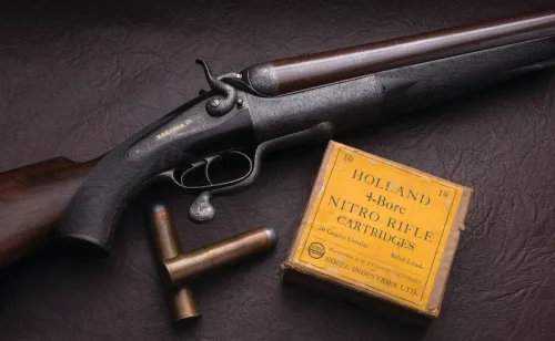 1898年にジョン・リグビー社が発表した.450 ニトロエクスプレスは、アフリカやインドの大型危険獣(デンジャラスゲーム)を仕留めるのに十分な威力を持ち、初期の排莢不良を克服した後は広く普及しました。この成功を受けて各社が既存の黒色火薬弾を改良し、.500や.577、さらに1903年の.600 ニトロエクスプレスなど、より強力な弾薬が登場しましたが、銃が重いため専門のプロハンター向けに限られました。