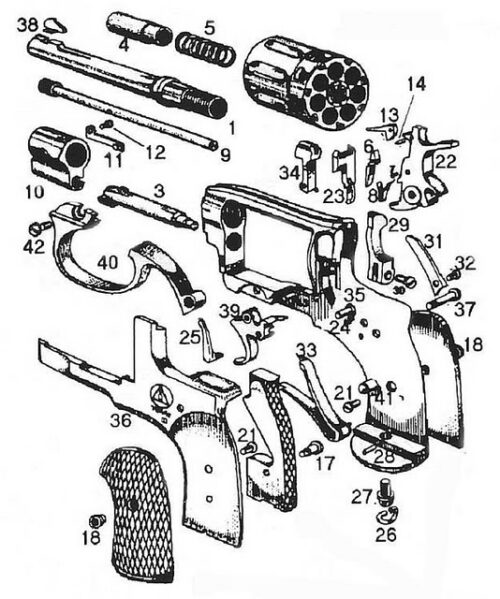 シリンダーラッチ(サムピース)はボタン式で、操作方法はルガーGPシリーズと同じです。このタイプは親指でラッチを抑えながら人差し指でシリンダーをスイングアウトしやすく、慣れるとS&Wやコルトより扱いやすいのでお勧めです。