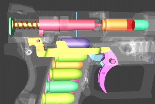 解放されたハンマーは回転し、ファイアリングピン(図:緑の棒状パーツ)を叩いて弾が発射されます。