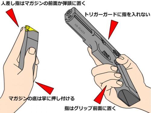 リボルバーを撃つとバレルとシリンダーの間(シリンダーギャップ)から高圧のガスが噴射されるため、グリップには細心の注意を要します。